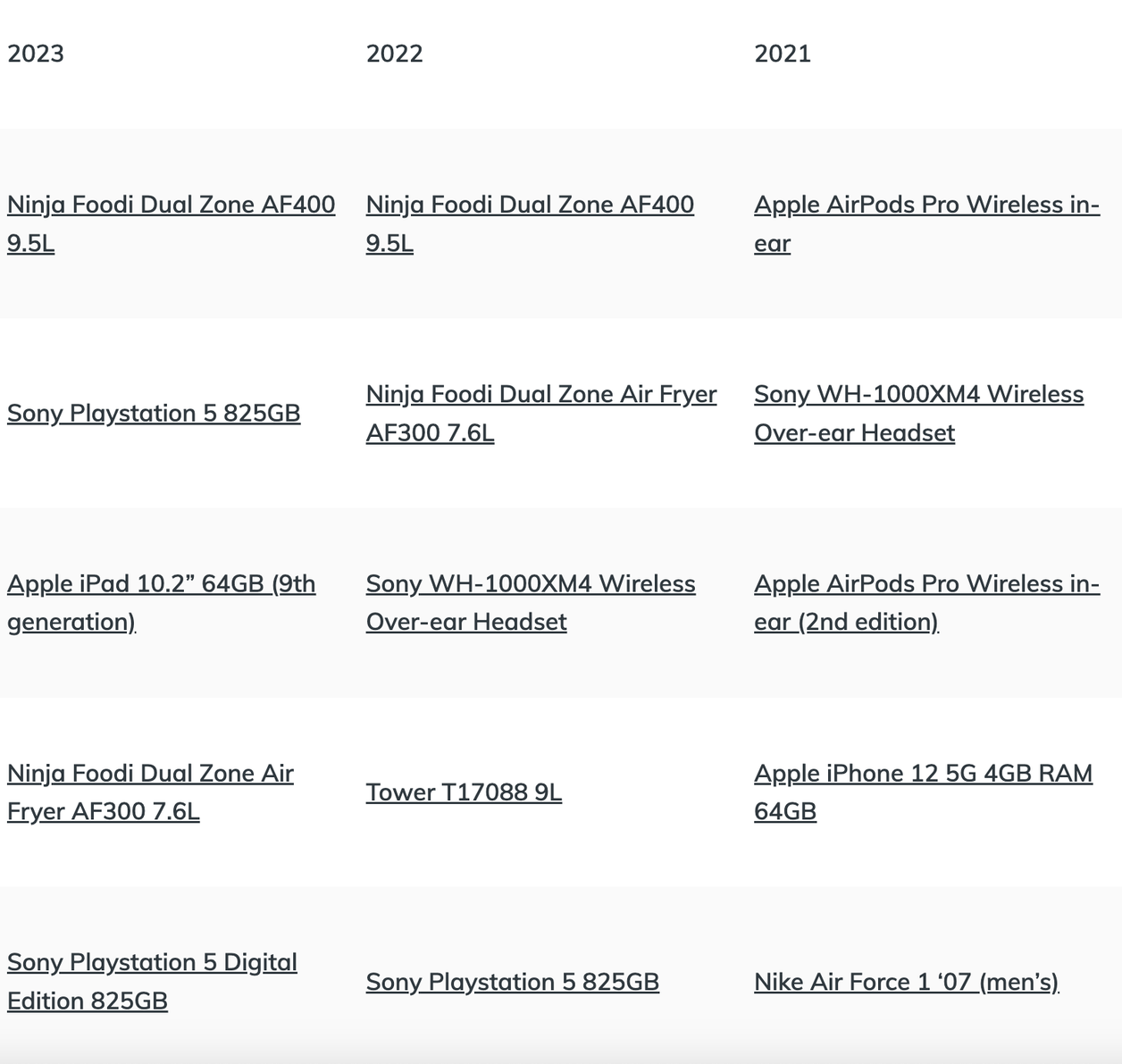 Table: Most popular products on PriceSpy between 1st January - 12th December 2021, 2022, 2023