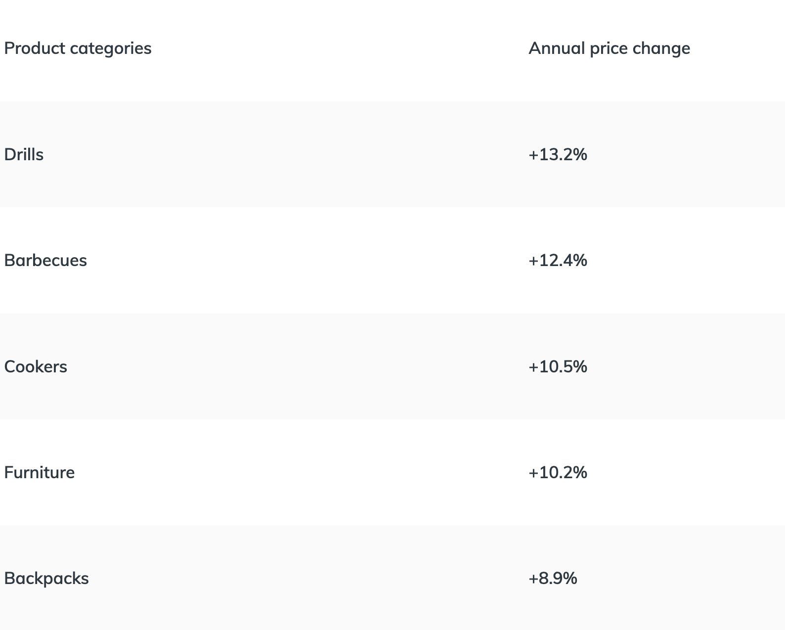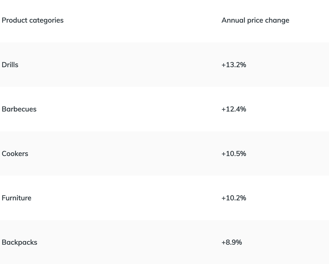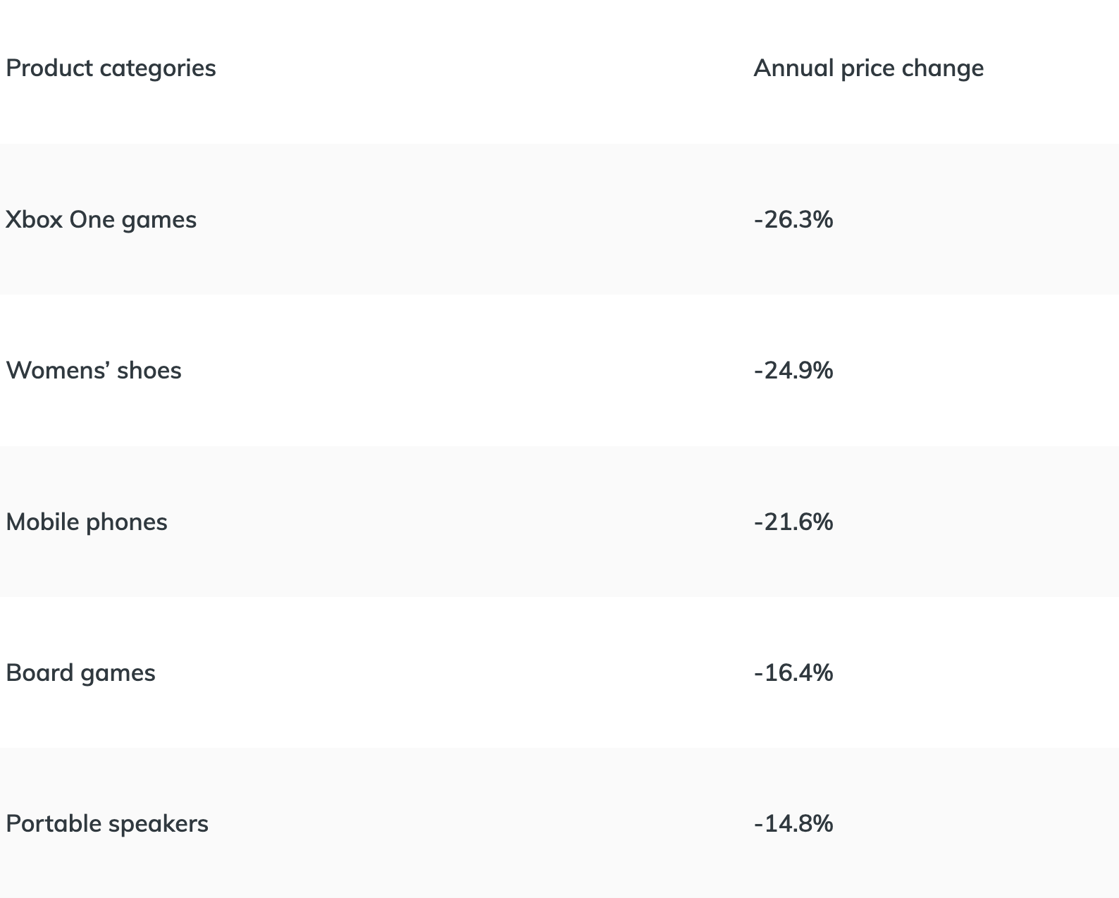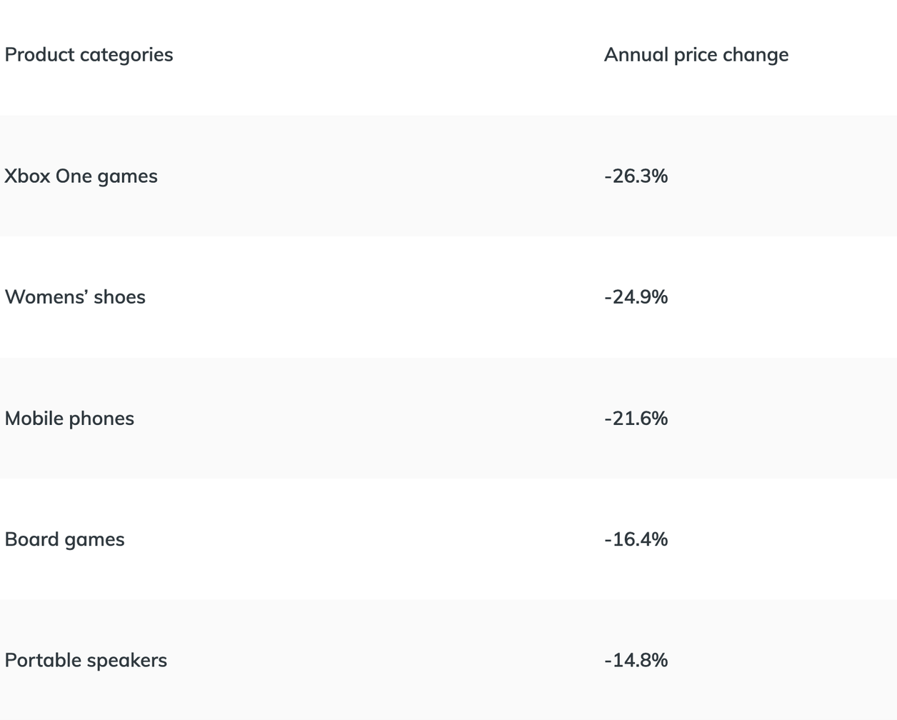 Table: Price difference between 1st January 2023 - 12th December 2023 according to PriceSpy’s Price Index, of categories with >200 products