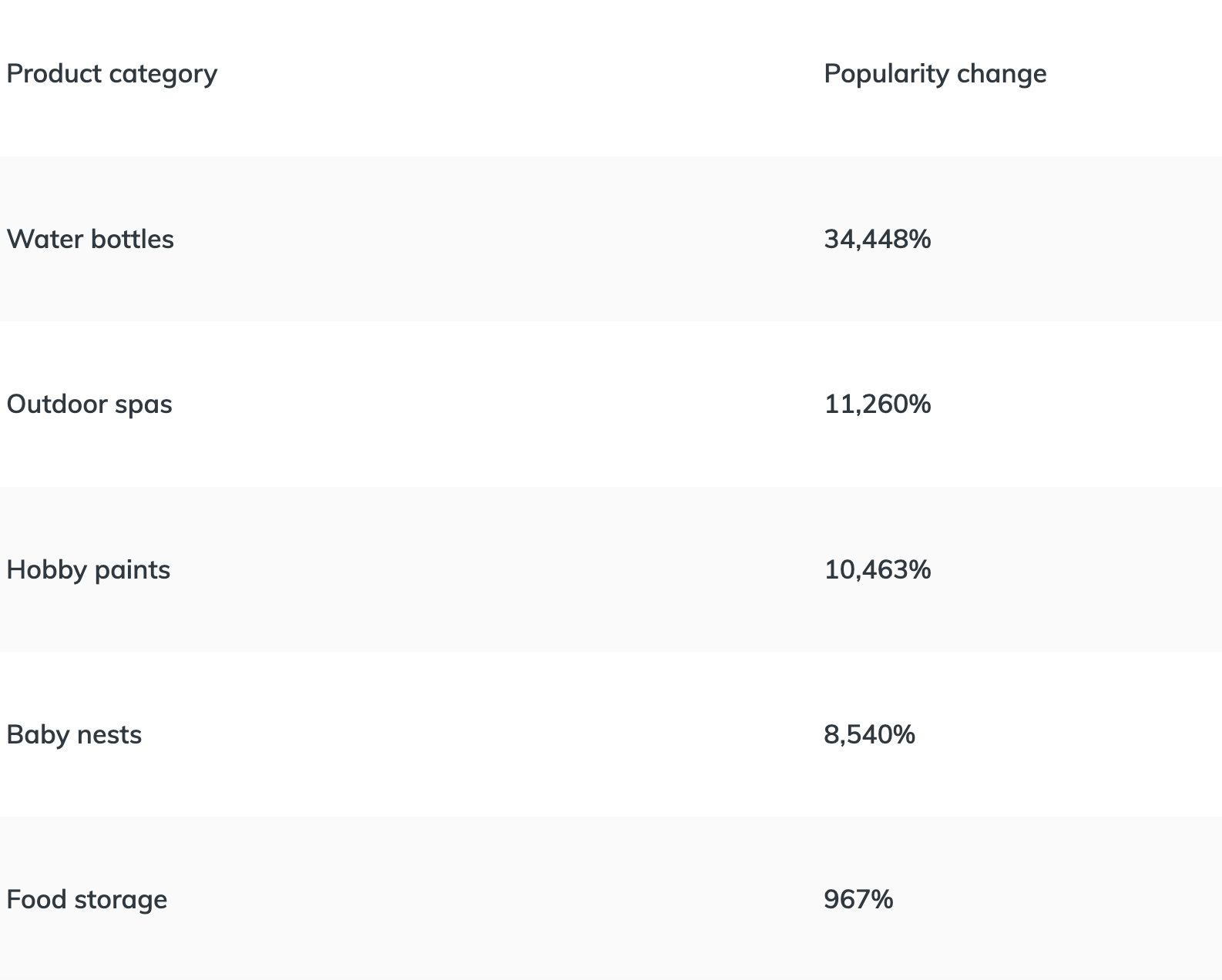 Reusable water bottles have seen the biggest rise in popularity - by far - over the past year, according to PriceSpy’s trending data. With food storage items also appearing in the top five, indicating that consumer demand for reusable, sustainable products is showing no sign of slowing