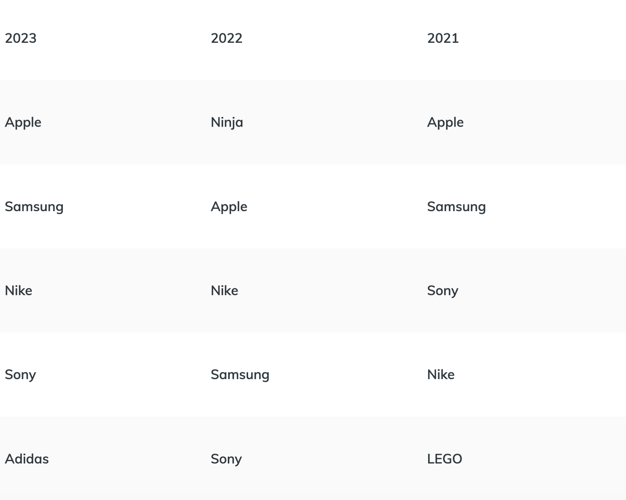 Table: Most popular brands on PriceSpy between 1st January - 12th December 2021, 2022, 2023