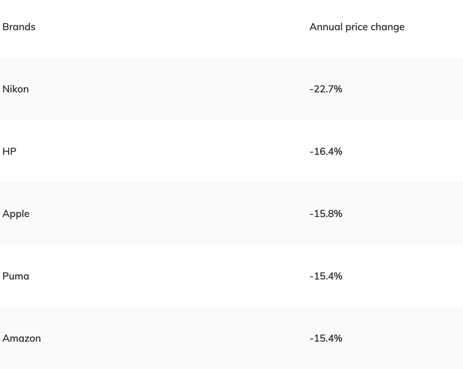 Table: Price difference between 1st January 2023 - 12th December 2023 according to PriceSpy’s Price Index, of brands with >200 products