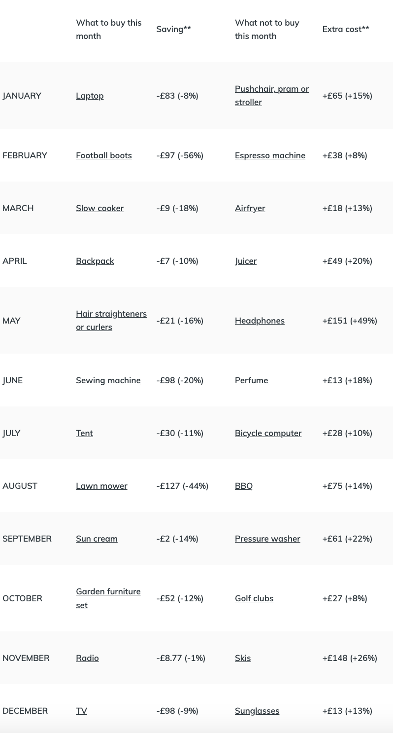 Unsurprisingly, PriceSpy’s data demonstrates that buying products slightly out of season can deliver big savings. For example, putting off the purchase of that new garden furniture set until October can save you 12%.