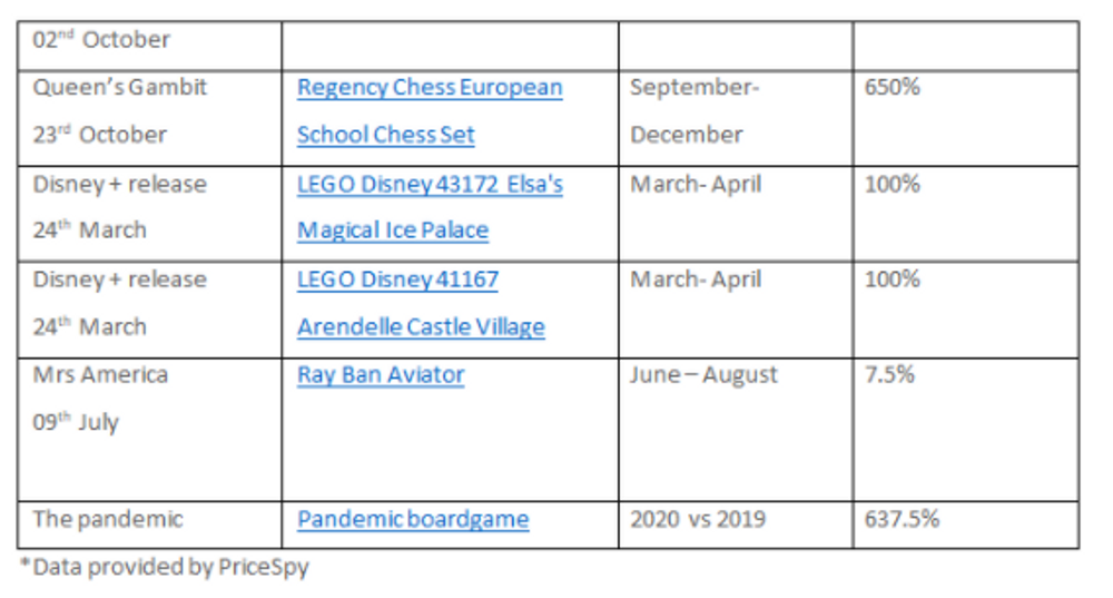 PriceSpy UK commercial director, Ossie Bayram, comments: “As lockdowns confined us indoors, streaming TV shows has been a go-to way for Brits to pass the time. What we watch is having a significant impact on what we buy, from shopping for toys related to the Mandalorian series, to many taking up chess after the sensation of The Queen’s Gambit on Netflix.