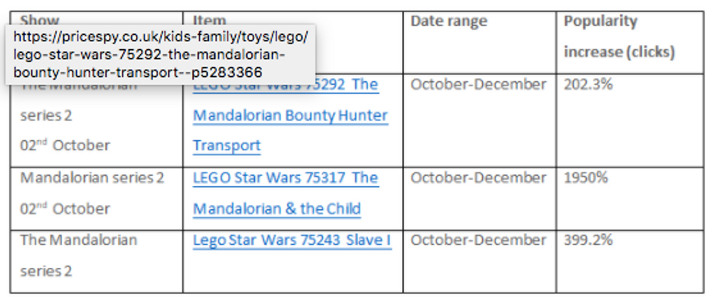 · Series 2 of The Mandalorian in October caused a 1950% increase in popularity of LEGO Star Wars The Mandalorian & The Child from October to December