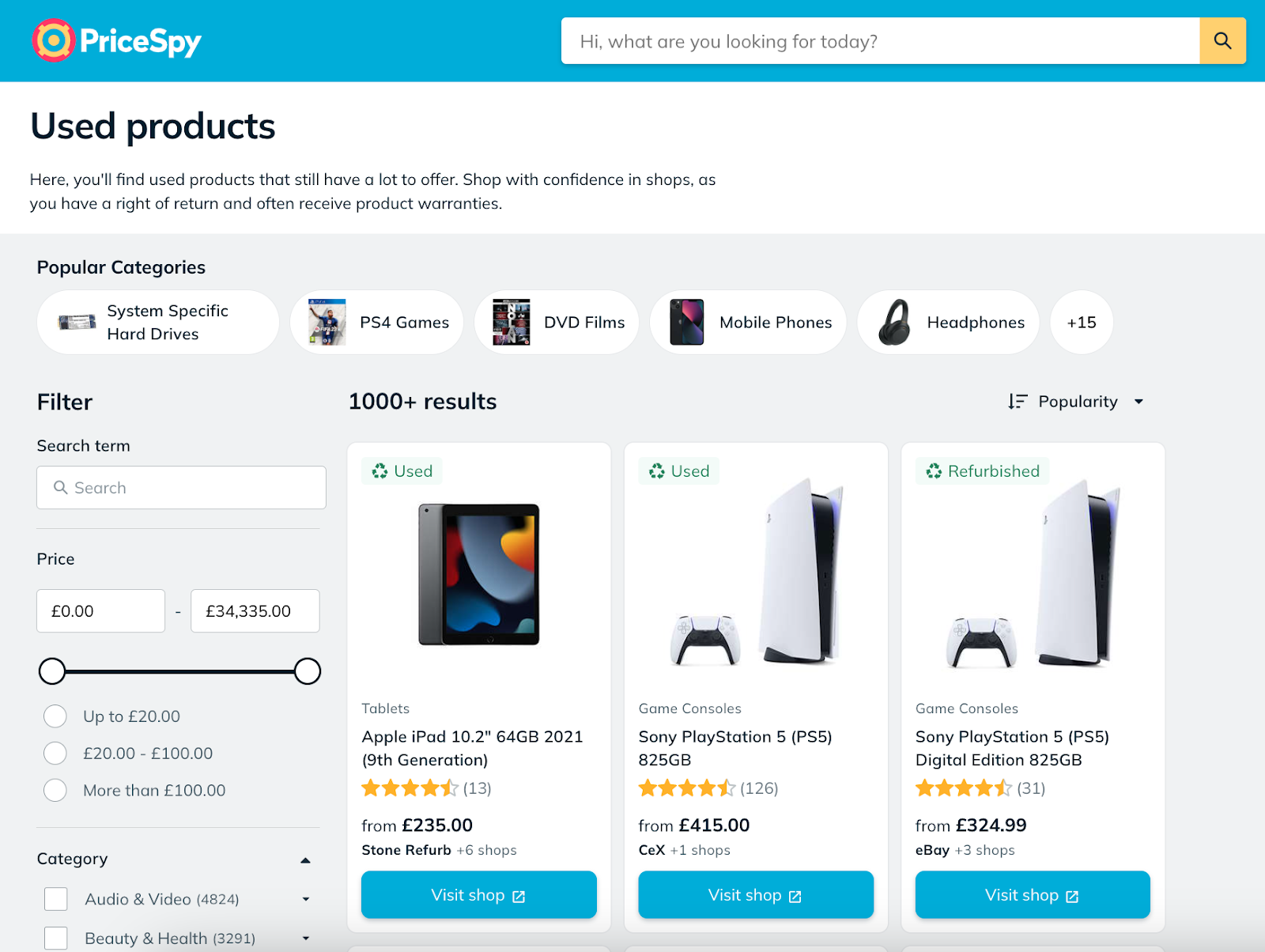 PriceSpy users will find used-goods on sale from popular, trusted, well-known retailers including: eBay, CeX, Game.co.uk, and more. With products from brands ranging from HP and Adidas, to LEGO, Dior, - and many more.