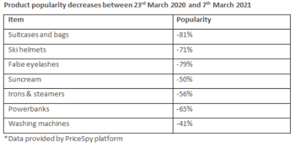 Of course where there are winners, there are also losers and these too are largely reflective of our sudden shift in lifestyle. With the Great British public encouraged to stay home, suitcases and bags took an 81% hit in interest. Sun cream was down 50%, and interest in winter sun also took a plunge, with a 71% reduction in interest in ski helmets.