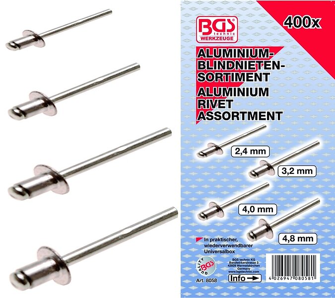 BGS Nitassortiment alu 2,4-3,2-4,0-4,8mm, 400 delar