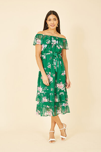 Yumi Green Floral Bardot Midi Dress With Frill Hem