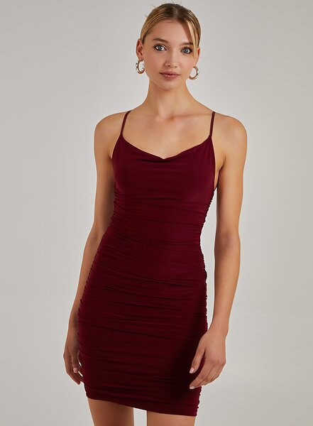 Pink Vanilla Cowl Neck Ruched Slinky Mini Dress