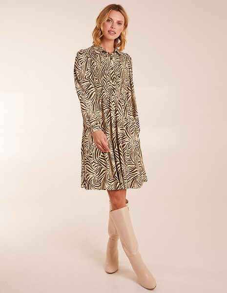 Blue Vanilla Zebra Shirred Long Sleeve Mini Shirt Dress