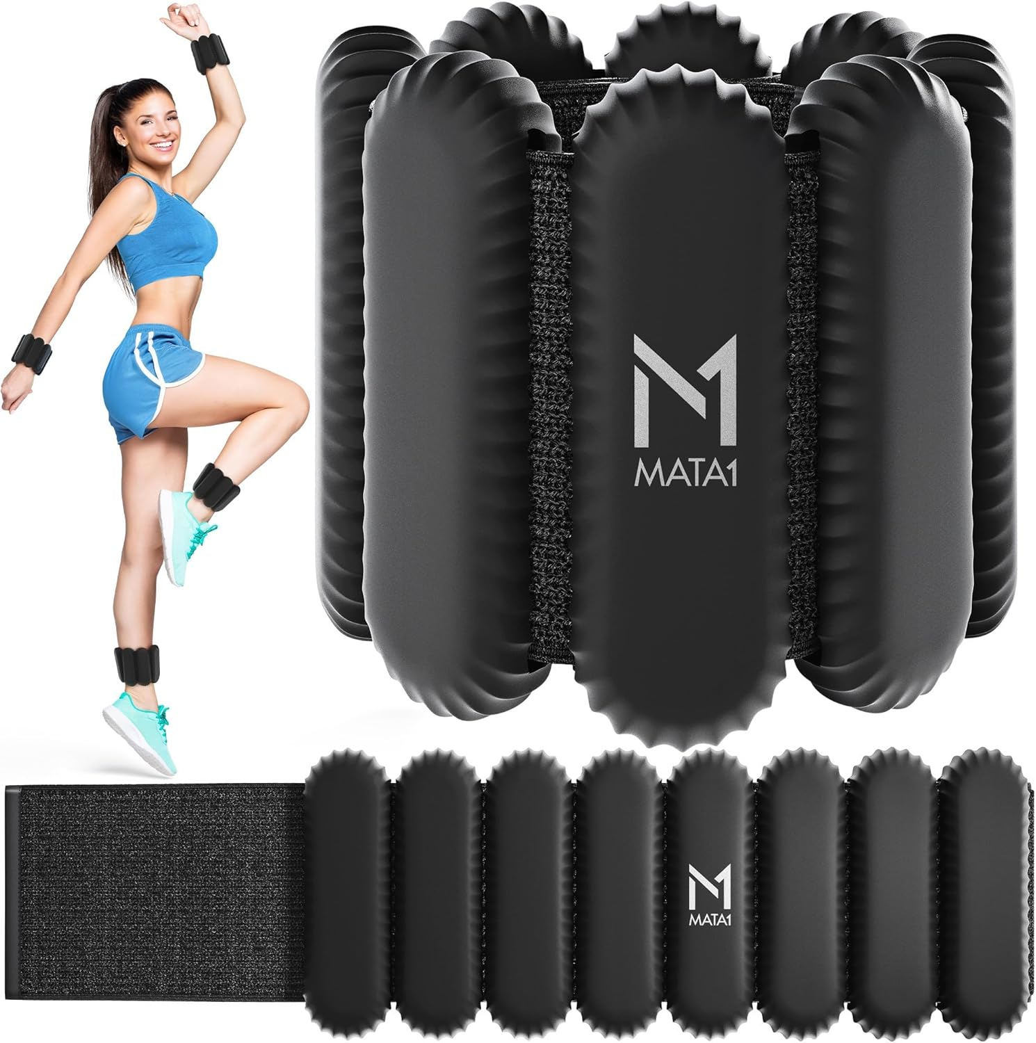 Ankle & Wrist Weights for Men & Women - Set of 2, 1 lb / 0.5 kg each, Black - Adjustable Silicone Workout Bands w/Removable Weights for Fitness & Training - by Mata1