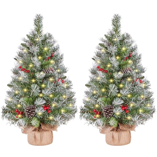 Yaheetech 2Pcs Pre-Lit Artificial Mini Tabletop Christmas Tree, 3ft/92cm Frosted Battery Operated Small Xmas Trees with 50 LED Lights, 70 Red Berries &10 Pinecones for Festival Decoration