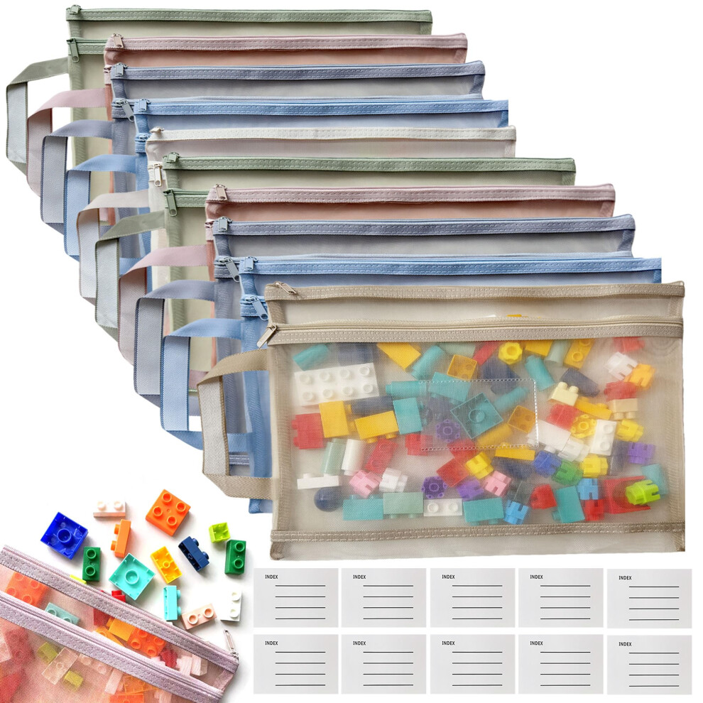 Colored Mesh Zipper Pouch Bags - 10PCS A4 Double-Layer Nylon Puzzle Building Block Sets Toy Storage & Organization For Lego, Breathable Through Zipper Pouch with Handle Pocket for School Office Games