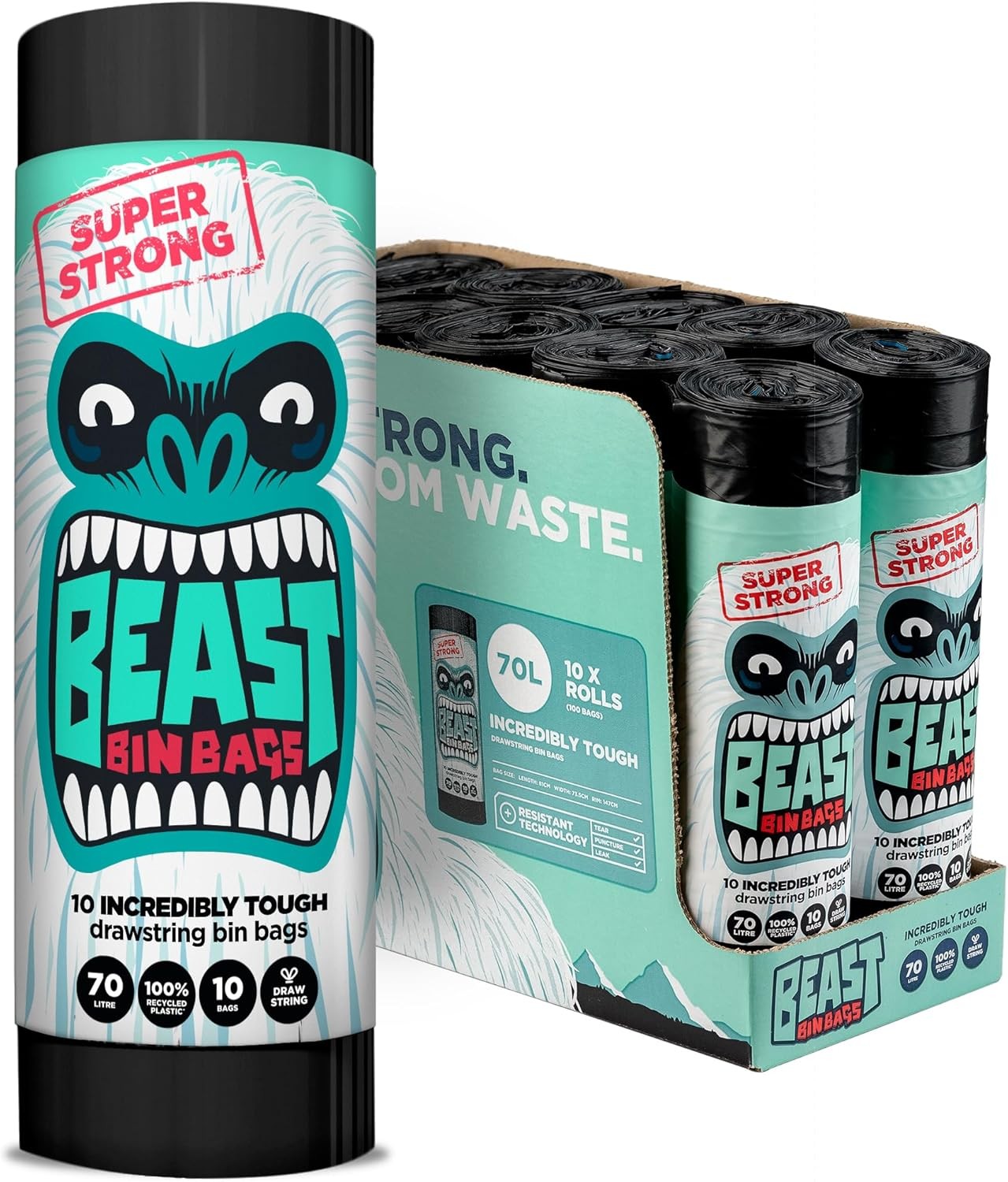 BEAST BIN BAGS, 10 Rolls of 10 x 70 Litre Bags (Total 100 Bags) - Made From 100% Recycled LLDPE - Incredibly Strong Drawstring Black Bin Bags
