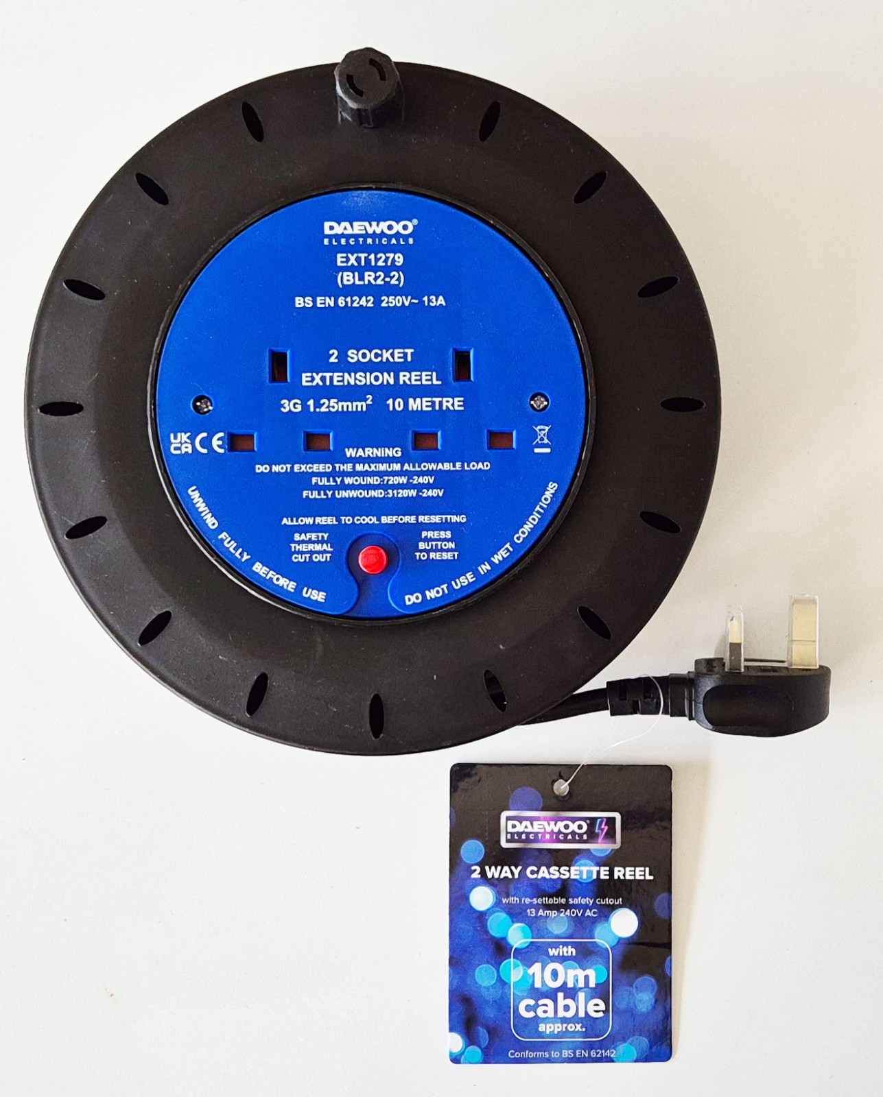 Daewoo 10 Meter Extension Lead Cable 2 Way Socket Electric Power Reel Cord New