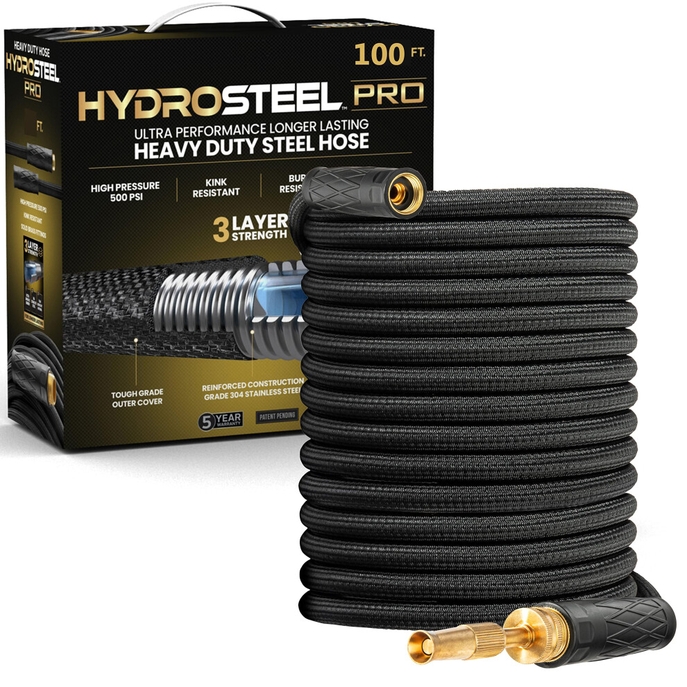 HYDROSTEEL PRO 100 Ft Metal Garden Hose with Nozzle Indestructible 3-Layer Stainless Steel Heavy Duty Water Hose 100 Ft x 5/8 in. Kink Free Design W