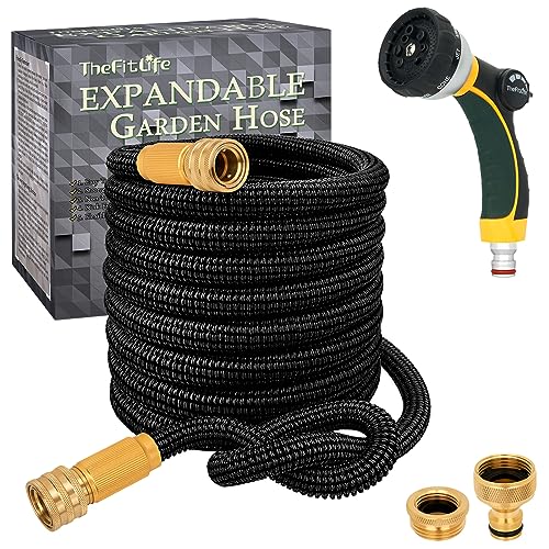 TheFitLife Expandable Garden Hose Pipe - Triple Core Latex and Solid Metal Fittings 8 Pattern Spray Nozzle EU Standard Expanding Kink Free Easy Storage Flexible Water Hose (50 FT, Black)
