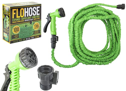 PMS Garden Hose FloHose - Length 30m/100ft Expandable Hose with Multiple Spray Settings. Garden Hose Spray Gun. High Pressure Hose Attachment. Garden Tools. Car Washing Kit
