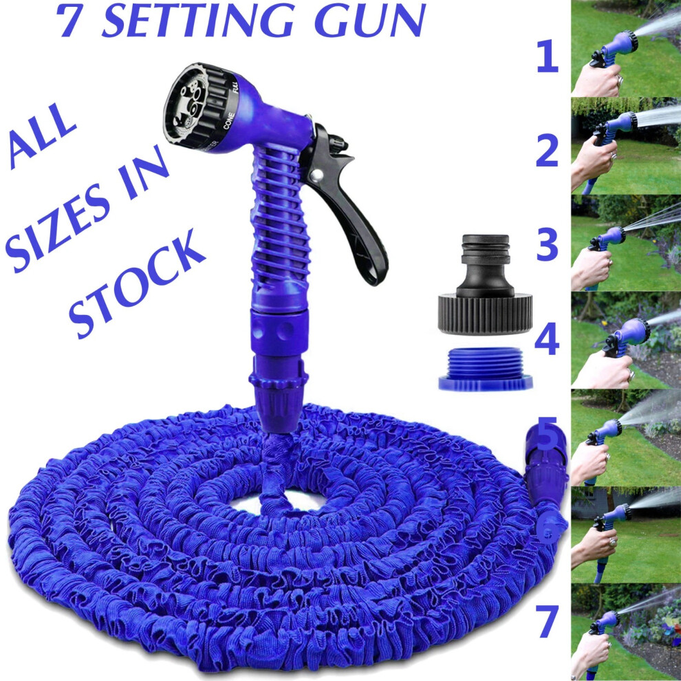 (Blue, 100ft) Expandable Garden Hose Pipe Anti Kink With 7 Function Water Spray Gun Magic Hose