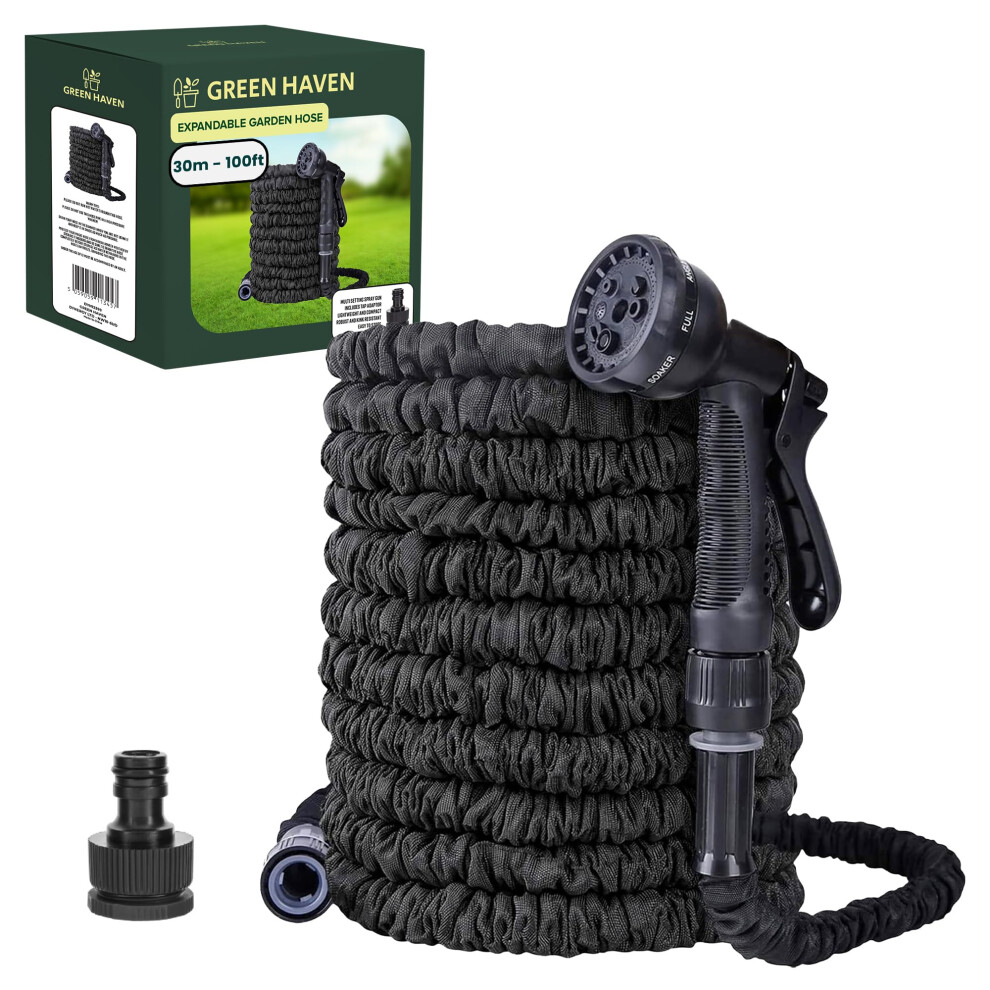 Green Haven Expandable Garden Hose - 100ft/30m Pipe with 8 Spray Modes - Extra Strong Solid Brass Fittings with No-Kink Design - Leak-Proof Extendable