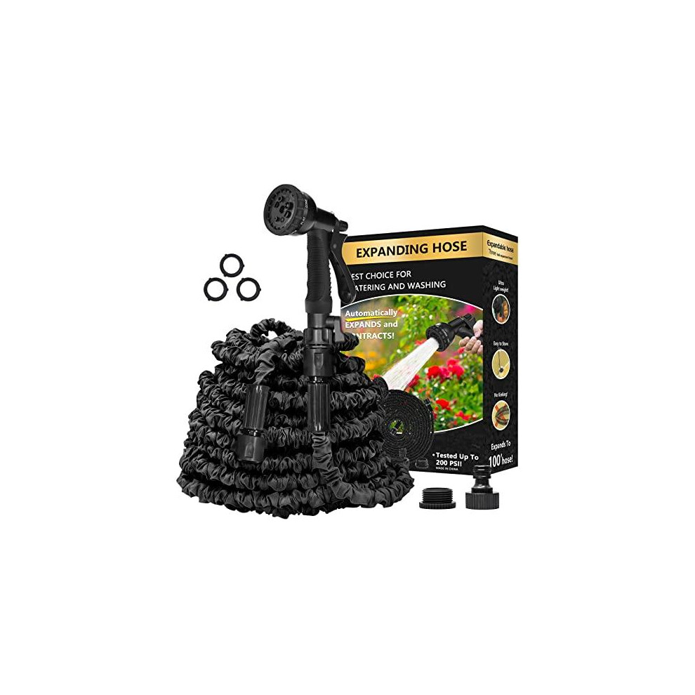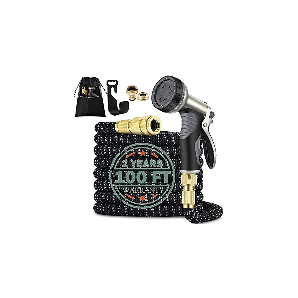 Expandable Garden Hose Pipe 100FT 3 Times Flexible Expanding Magic Lightweight Watering Hose Anti-Leakage with 3/4" 1/2" Solid Brass Fittings 8 Function Spray Nozzle (Black)