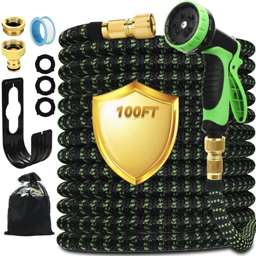 Garden Hose Expandable Garden Hose, Flexible Water Pipe with 10 Type Nozzle, Solid Brass Fittings Leak Proof, Extendable, Lightweight, no Twisting, Garden Watering, Car Washing, Pet Bathing (100FT)