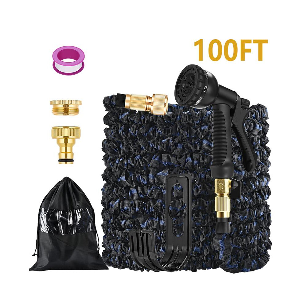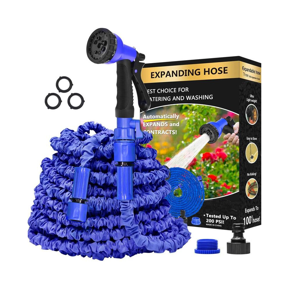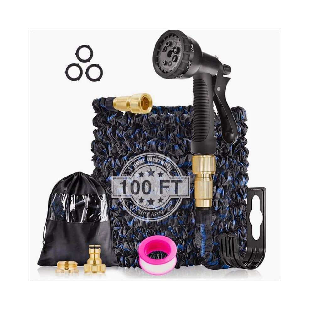 (Blue, 100ft) Expandable Garden Hose Pipe Anti Kink With 7 Function Water Spray Gun Magic Hose