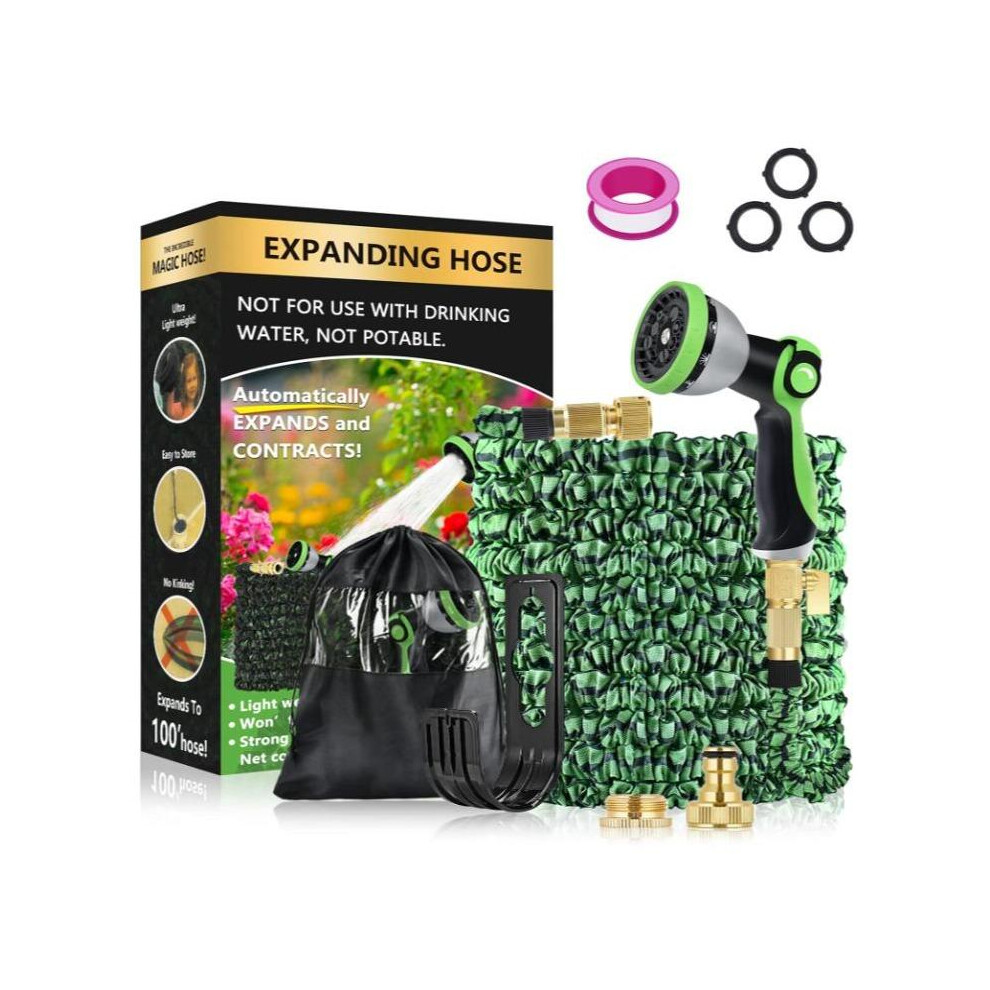 (Green, 100ft) Expandable Garden Hose Pipe Anti Kink With 7 Function Water Spray Gun Magic Hose