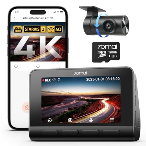 70mai 4K Dash Cam Front and Rear A810, 4K+1080P HDR Dash Cam with Night Vision, WiFi APP Control, 150°Wide Angle, 24/7 Parking Mode, G-Sensor, Loop Recording for Cars, Vans, Included 128GB Card