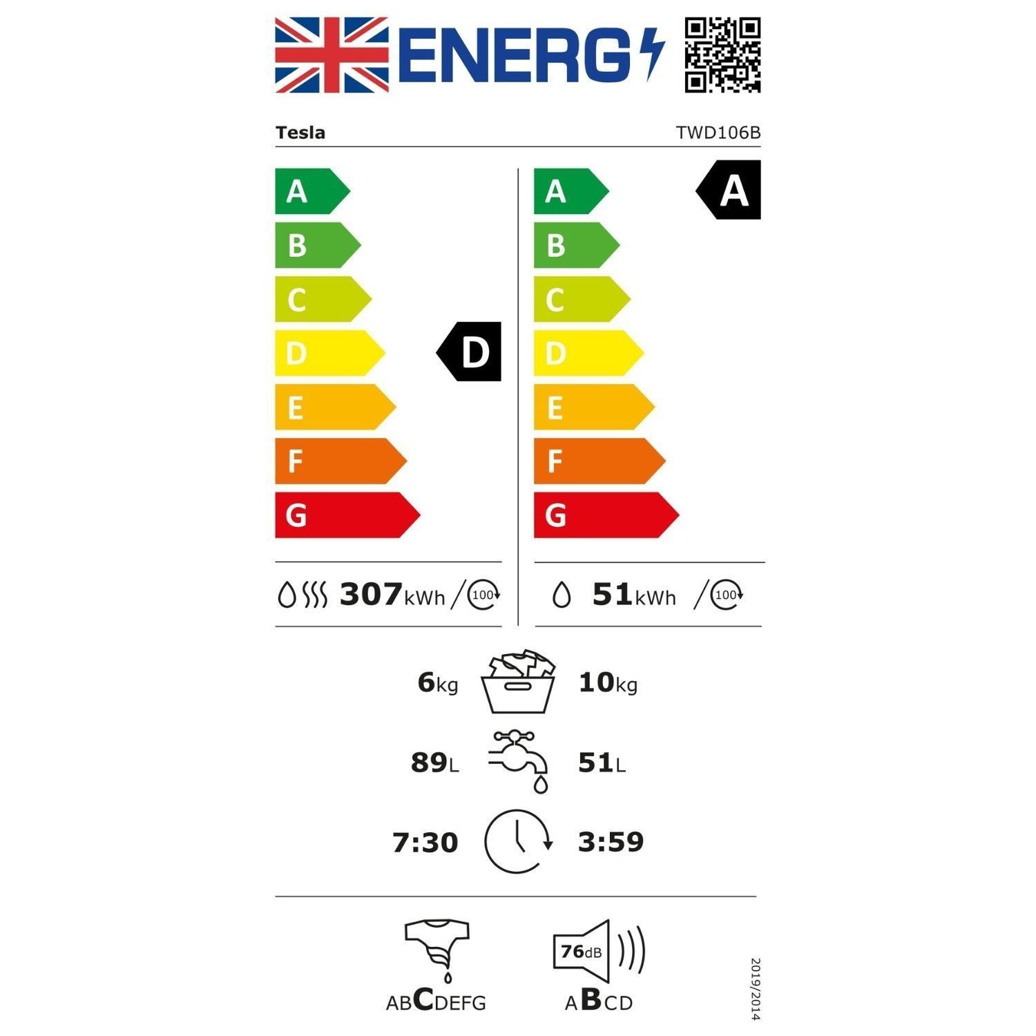 Tesla TWD106W - White 10KG/6KG Washer Dryer - 1400RPM - B Energy