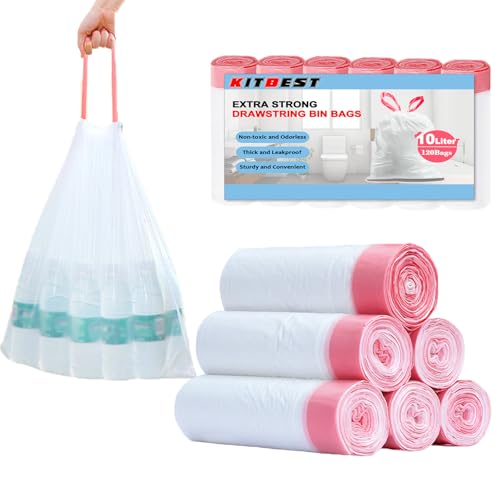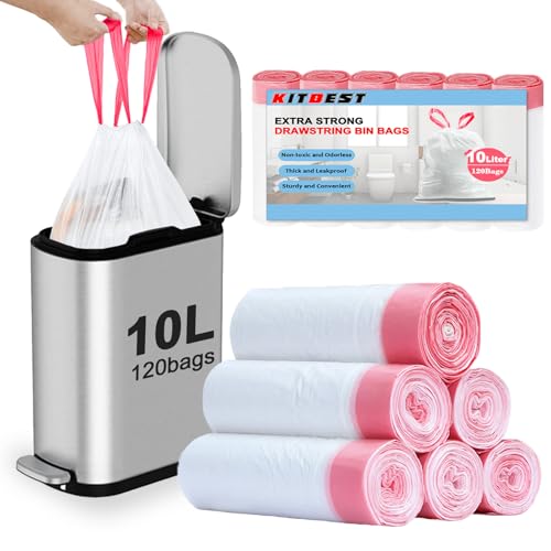 10L Bin Bags Small Bin Liners (120 Bags), Drawstring Trash Bags with Tie Handle, KITBEST No-Tear Caddy Liner Pedal Garbage Bags for Bathroom, Toilet, Kitchen, Office Waste Bin (45x50cm)