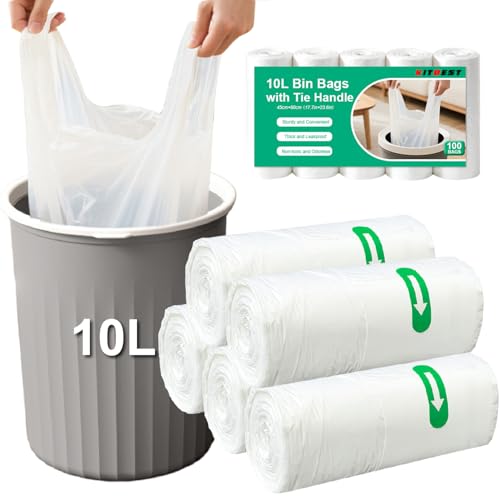 Small Bin Bags 10L with Tie Handle, 100 Plastic Pedal Trash Bin Can Liners, KITBEST Thick Clear Garbage Rubbish Waste Bag for Bathroom Toilet Bedroom Office Kitchen, Unscented, White (45×60cm)