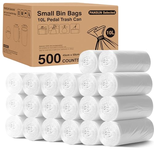 PANSUN Selected 500 Pack Small Bin Bags, 10L White Unscented Pedal Bin Liners, Bulk Supply for Office, Hotel, Restaurant, School