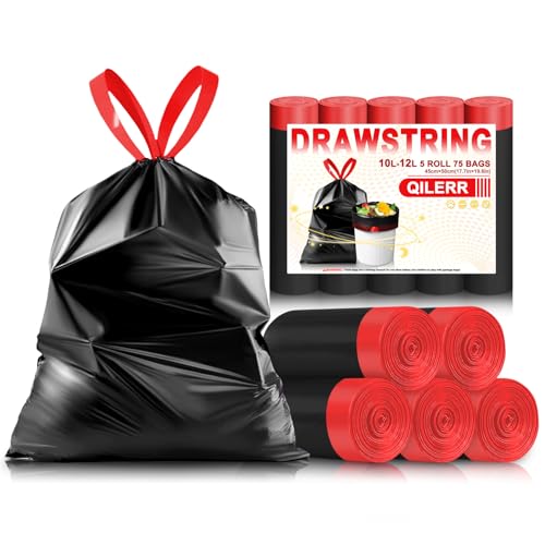 Small Bin Liners 10L, 75 Count Thick Drawstring Bin Bags with Tie Handles, Black Waste Bags for Bathroom Kitchen Office Bedroom, Fits 10-15L Bins (Pedal/Waste Paper Bins)