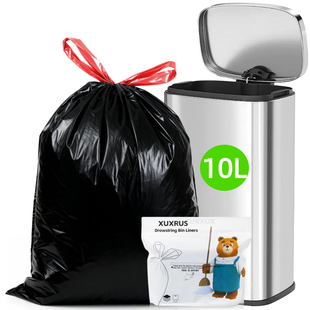 XUXRUS 10L Bin Bags Pedal Bin Liners 60 Bags Small Drawstring Tear-Resistant Black Rubbish Bags, Thickened & Leak-Proof for Kitchen/Bathroom/Bedroom