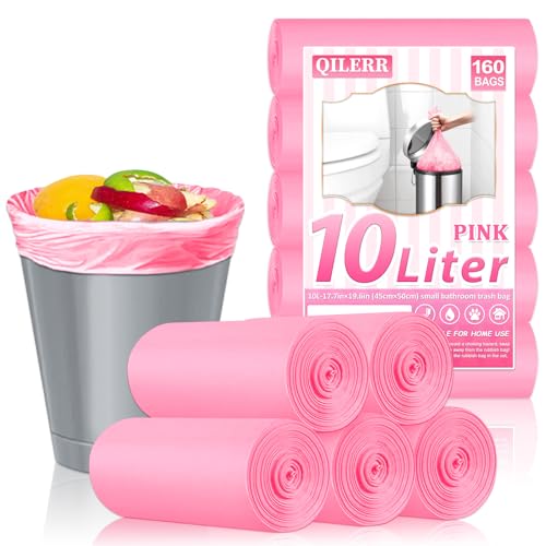 QILERR 10L Small Bin Liners Bathroom Bin Bags 160 Pack - Extra Thick Pink Heavy Duty Pedal Waste Bags for Kitchen, Office, Fits 10-15 L Rubbish Bin