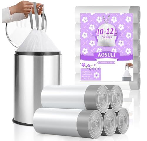 AOSULI Pedal Bin Liners 10L-12L Bin Bags Small Rubbish Bags Tie Handles Trash Bags 75 Counts White Plastic Drawstring Garbage Bags for Bathroom,Toilet,Office,Bedroom,fit 7L,8L,9L,15L Waste Bin