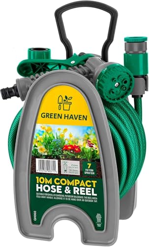 Green Haven Garden Hose Pipe Reel – 10m / 32ft Lightweight Compact Hosepipe with 7-Pattern Spray Nozzle Gun, Easy Wind Mini Hose Reel for Small Gardens, Balconies & Outdoor Cleaning
