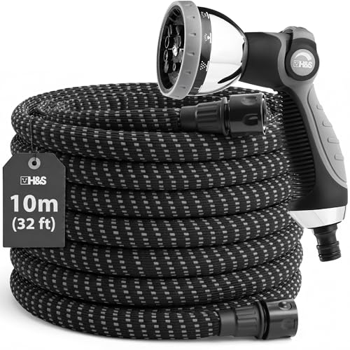 H&S Alliance Expandable Garden Hose Pipe 10m (32') - Hosepipes for Garden Outdoor Use - Double Expansion for Efficient Watering - 10 Function Spray Gun with Thumb Control
