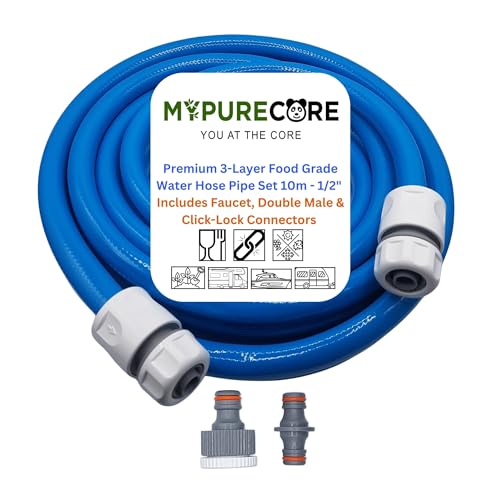 MYPURECORE Premium 3-Layer Food Grade Water Hose Pipe | 10m, 1/2" | Includes Faucet, Double Male & Click-Lock Connectors | Motorhome, Caravan & Campervan Accessories | Campers & Motorhome Gadgets