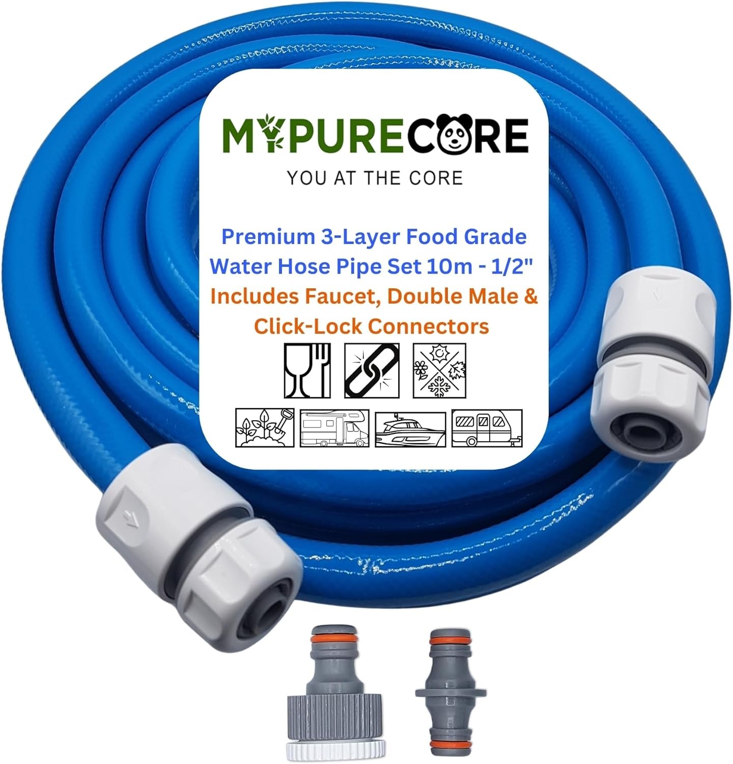 MYPURECORE Premium 3-Layer Food Grade Water Hose Pipe | 10m, 1/2" | Includes...