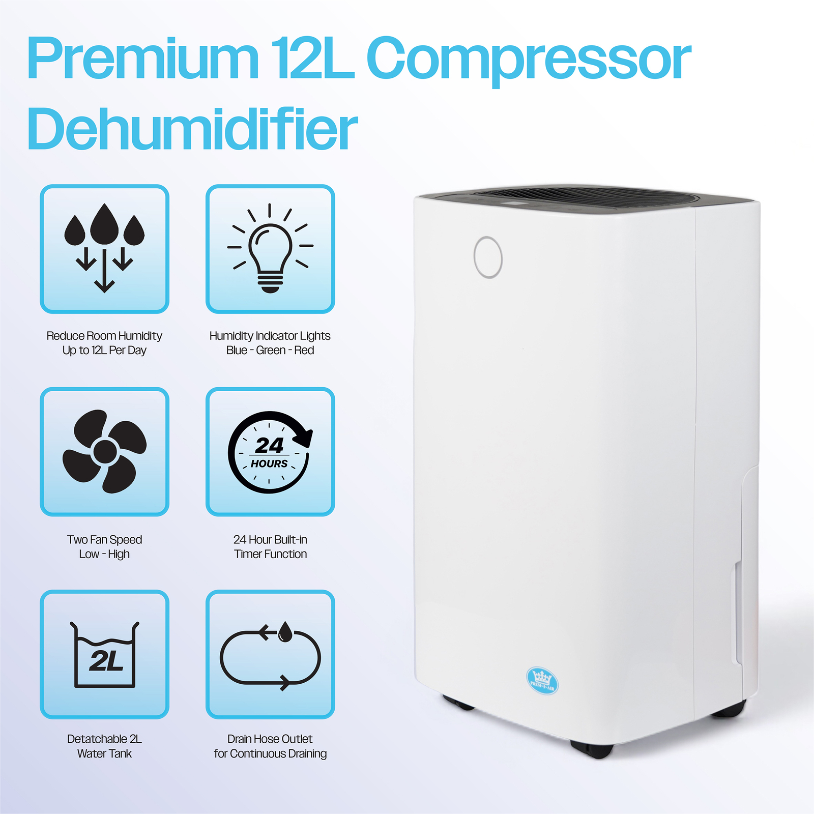Prem-I-Air 12L Compressor Dehumidifier - 2 Fan Speeds - 2L Tank & 24hr Timer
