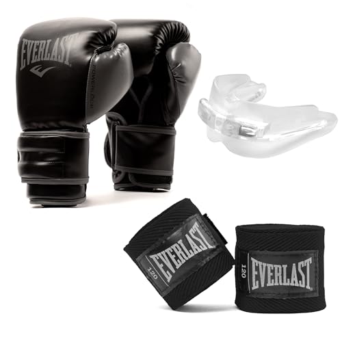 Everlast Powerlock Boxfit Kit (14oz Boxing Gloves, Hand Wraps and Double Mouth Guard) Gold/Black Boxing Gloves for Bags and Sparring, Hook and Loop, Quad-Layered Foam - Authentic Everlast Gear