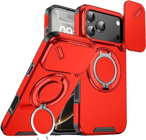 VNDGEOUH Case with Slide Camera Cover for iPhone 16/15/14/13/12/11 Pro Max, Rotatable Ring Kickstand, Privacy Camera Cover(Red,For 14 ProMax)