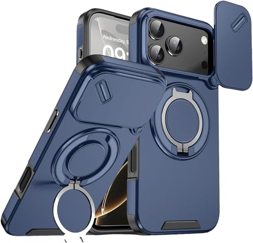 VNDGEOUH Case with Slide Camera Cover for iPhone 16/15/14/13/12/11 Pro Max, Rotatable Ring Kickstand, Privacy Camera Cover(Blue,For 14 ProMax)