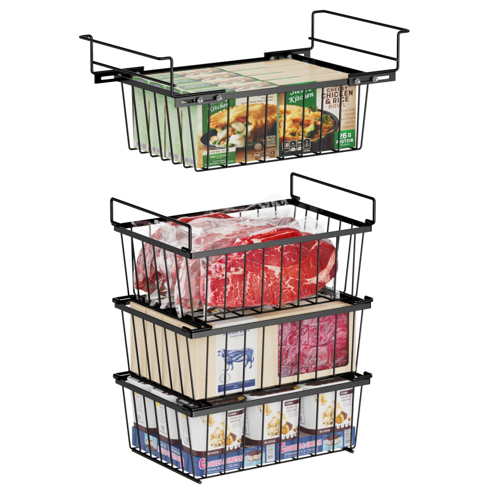 iSPECLE Chest Freezer Baskets - 4 Pack Stackable Wire Storage Bins for 142 Litre Deep Freezers, Metal Organiser with Handles Easy Get Meat & Meals, Allows Air Circulation for Better Freshness, Black