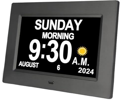 Yuanzeco Alarm Clock With Date & Calendar - 7" Digital Day Clock & Photo Frame - Auto Dimmable Display, 15 Alarm Options, Non-Abbreviated Day & Month (Black)