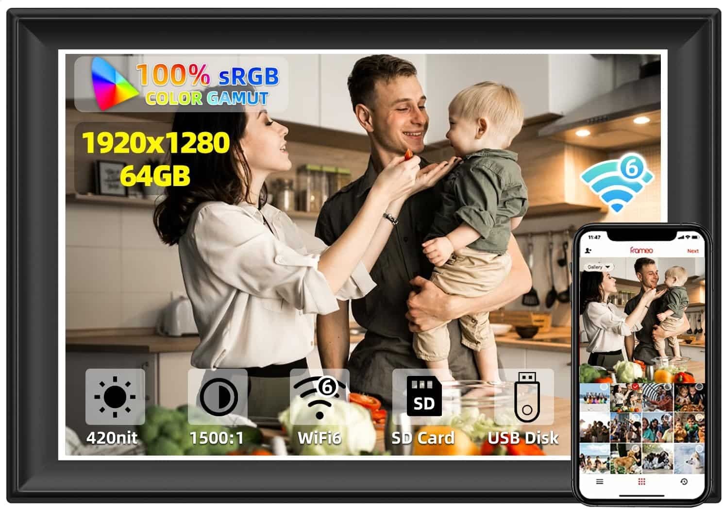 10.6 Inch Digital Photo Frame, 64GB Memory, 1920x1280 Resolution, Touch Screen, WiFi 6&5G Frameo App for Instant Photo & Video Sharing Anywhere, Upload via SD Card & USB, Auto Rotate, Black Color