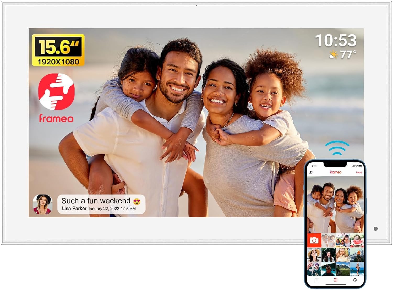 FRAMEO 15.6 inch WiFi Digital Picture Frame 1920x1080 FHD Large 32GB Smart Digital Photo Frame IPS Touch Screen Auto-Rotate Wall Mountable Share Photos/Videos Instantly via FRAMEO APP