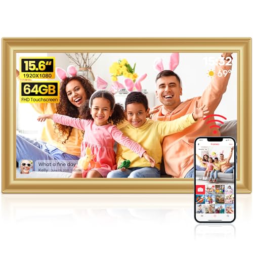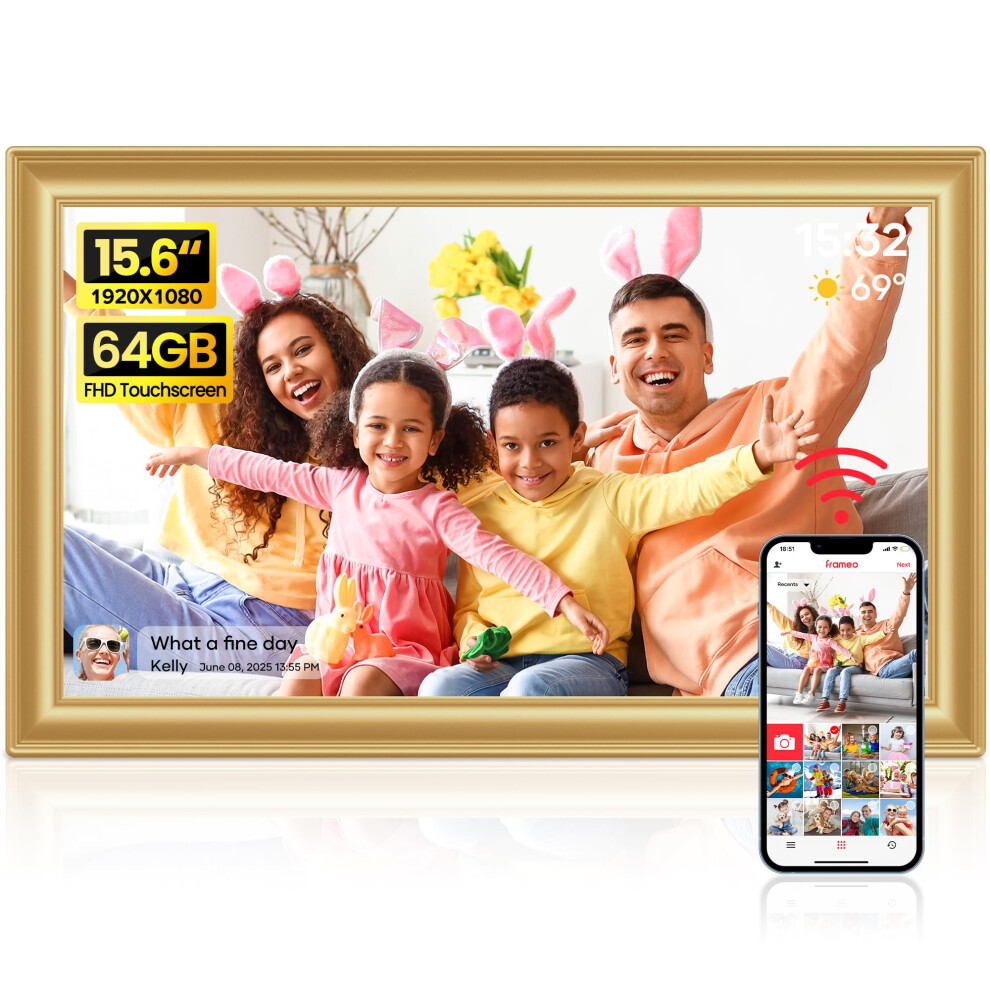 64GB Frameo WiFi Digital Photo Frame 15.6 Inch Golden - 1920 * 1080P FHD IPS Touch Screen Picture Frame Electronic, 64GB Memory, Auto Rotate, Wall Mountable, Sharing Photos and Videos